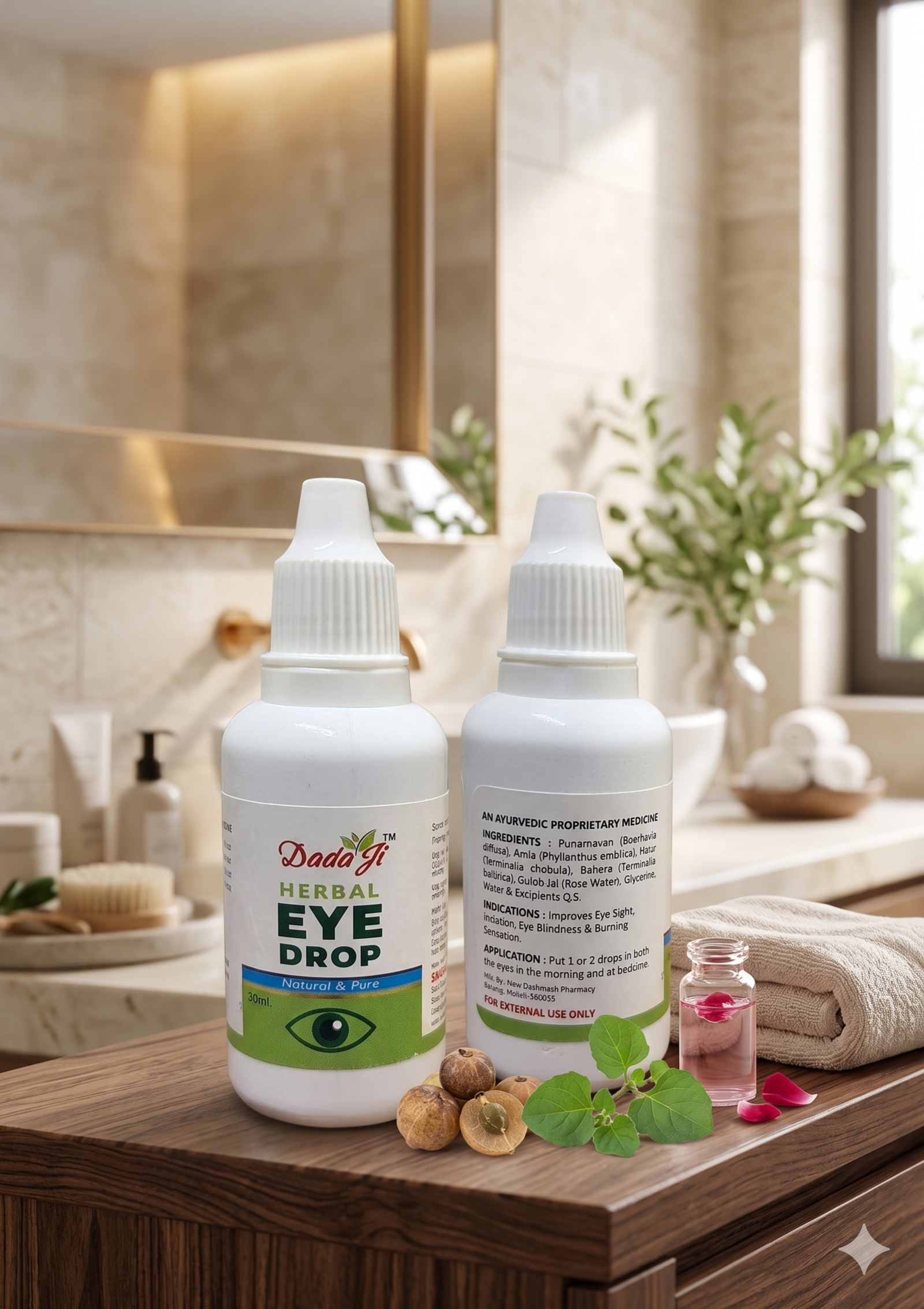 Ayurvedic eye drops for dryness, irritation, redness, and burning sensation. Made with natural ingredients like Amla, Gulab Jal, and Punarnava for gentle and effective eye care.